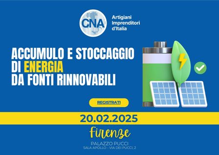 Si svolgerà giovedì 20 febbraio a partire dalle ore 10 a Palazzo Pucci a Firenze, l’iniziativa “Accumulo e stoccaggio di energia da fonti rinnovabili” organizzata da CNA Industria Nazionale, con il Contributo di CNA Industria Toscana.