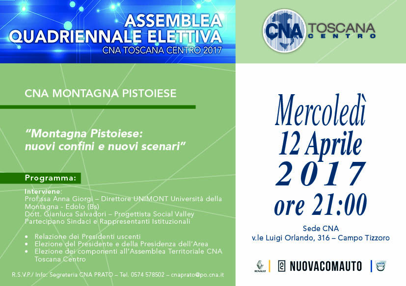 Si svolgerà mercoledì 12 aprile alle 21,00, all’interno della sede della CNA di Campotizzoro (via Luigi Orlando 316), l’Assemblea Quadriennale Elettiva dell’Area Montagna Pistoiese della CNA Toscana Centro.