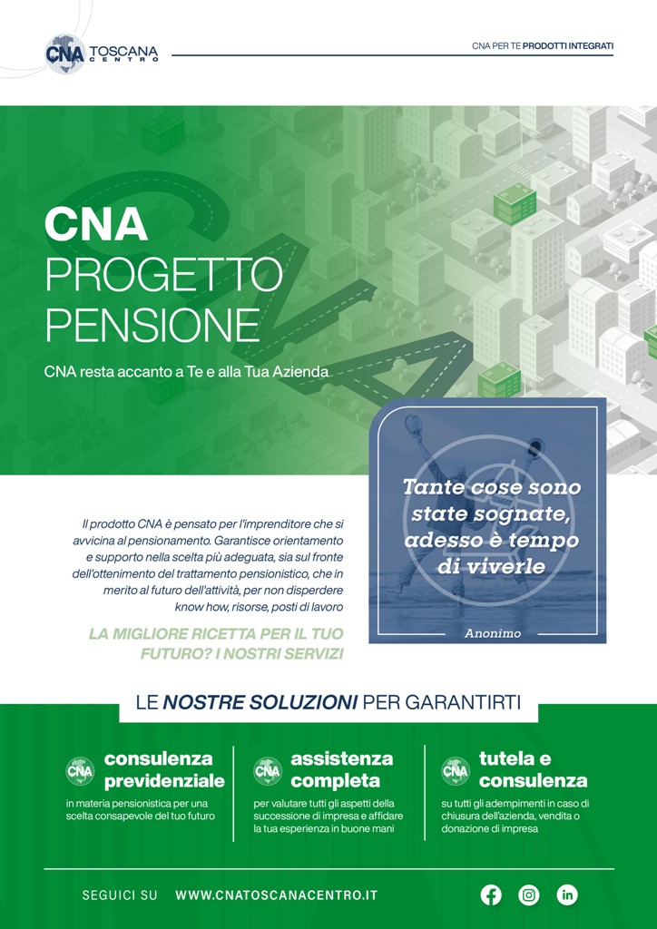PROGETTO PENSIONE è il prodotto che CNA TOSCANA CENTRO ha pensato per l’imprenditore che si avvicina al pensionamento, garantendo orientamento e supporto nella scelta più adeguata, sia sul fronte del trattamento pensionistico, che in merito al futuro dell’attività.