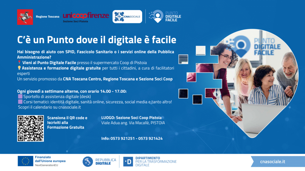 Nasce a Pistoia il Punto Digitale Facile: un’iniziativa completamente gratuita per aiutare tutti i cittadini a usare i servizi online, senza stress e senza paure. Un progetto promosso da CNA Sociale, Sezione Soci Coop Pistoia e Regione Toscana.
