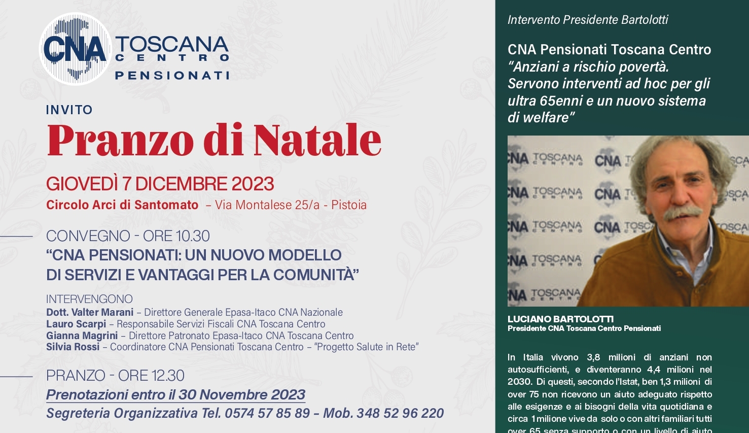 Il convegno (ore 10.30) sarà dedicato al focus “CNA PENSIONATI: UN NUOVO MODELLO DI SERVIZI E VANTAGGI PER LA COMUNITA’ “ con ospiti di prestigio come il Dott. Valter Marani (Direttore generale EPASA-ITACO), Lauro Scarpi (Resp. Servizi Fiscali CNA Toscana Centro), Gianna Magrini (Direttore del patronato EPASA -ITACO CNA Toscana Centro) e Silvia Rossi (Coordinatore di CNA Pensionati Toscana Centro) che interverrà sul progetto “Salute in rete”. Il PRANZO di Natale – costo 20 € a persona – si terrà poi alle ore 12.30 !!
