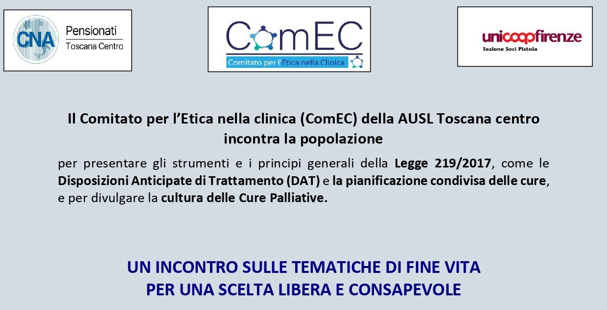 Il Comitato per l’Etica nella clinica (ComEC) della AUSL Toscana Centro, in collaborazione con CNA Pensionati Toscana Centro e Unicoop FI incontra la popolazione per presentare gli strumenti e i principi generali della Legge 219/2017, come le Disposizioni Anticipate di Trattamento (DAT) e la pianificazione condivisa delle cure, e per divulgare la cultura delle Cure Palliative.