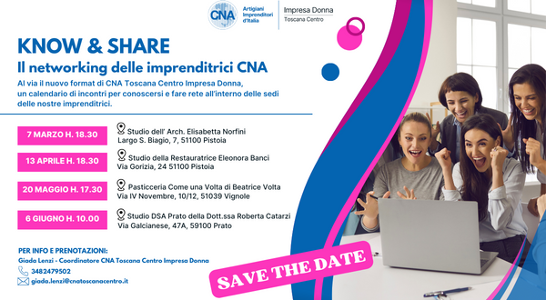 Al via il nuovo format di CNA Toscana Centro Impresa Donna, un calendario di incontri per conoscersi e fare rete all’interno delle sedi delle nostre imprenditrici. L’Iniziativa Know & Share, il networking delle imprenditrici CNA, promossa da CNA Toscana Centro Impresa Donna, nasce con l’obbiettivo di conoscere i fabbisogni, i desideri, le difficoltà e le aspettative delle donne imprenditrici del nostro territorio. Favorire questa rete di incontri e lo scambio fra donne che occupano nella società ruoli diversi e che fanno mestieri diversi, può far nascere sinergie importanti che, grazie al sostegno dell’Associazione, trovano uno spazio comune di condivisione. Questo ciclo di incontri, che avverrà quasi in concomitanza con la Festa della Donna, il primo sarà il 7 marzo, consentirà alle partecipanti di conoscere le realtà imprenditoriali di successo che di volta in volta ci ospiteranno. I primi quattro appuntamenti saranno in quattro aziende completamente diverse fra di loro, al cui comando ci sono quattro imprenditrici di CNA Toscana Centro che si sono distinte sia nella carriera che dentro alla nostra Associazione. Queste 4 mentor saranno a disposizione nelle loro sedi, assieme alla Presidente di CNA Toscana Centro Impresa Donna, Chiara Pasquali, per ospitare tutte le altre imprenditrici e imprenditori, che aspettiamo numerosi per iniziare questa rete di conoscenza e condivisione.