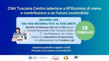 “ Second life – Dai una seconda vita ai tuoi abiti” – 18 febbraio 2025 ore 17.00, Sede CNA Via Perlasca, 41 Prato, Laboratorio di Upcycling in CNA Toscana Centro – in collaborazione con Creative Lab Francesca Scuffi (a cura di CNA Toscana Centro). Iscrizioni su Eventbrite !! –