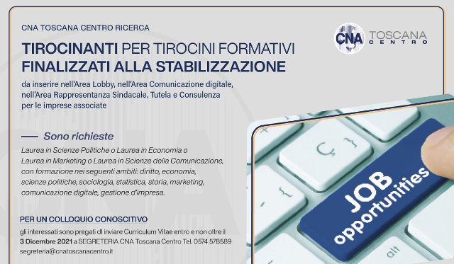 CNA Toscana Centro ricerca Tirocinanti per Tirocini Formativi finalizzati alla stabilizzazione da inserire nell’area Lobby, Comunicazione Digitale, Rappresentanza sindacale, Tutela e […]
